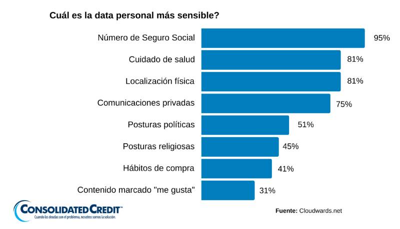 La tabla a continuación representa los tipos de datos, o información personal, y el porcentaje de personas que consideran la información personal más sensitiva, según un estudio de Pew Research Centers (en inglés).